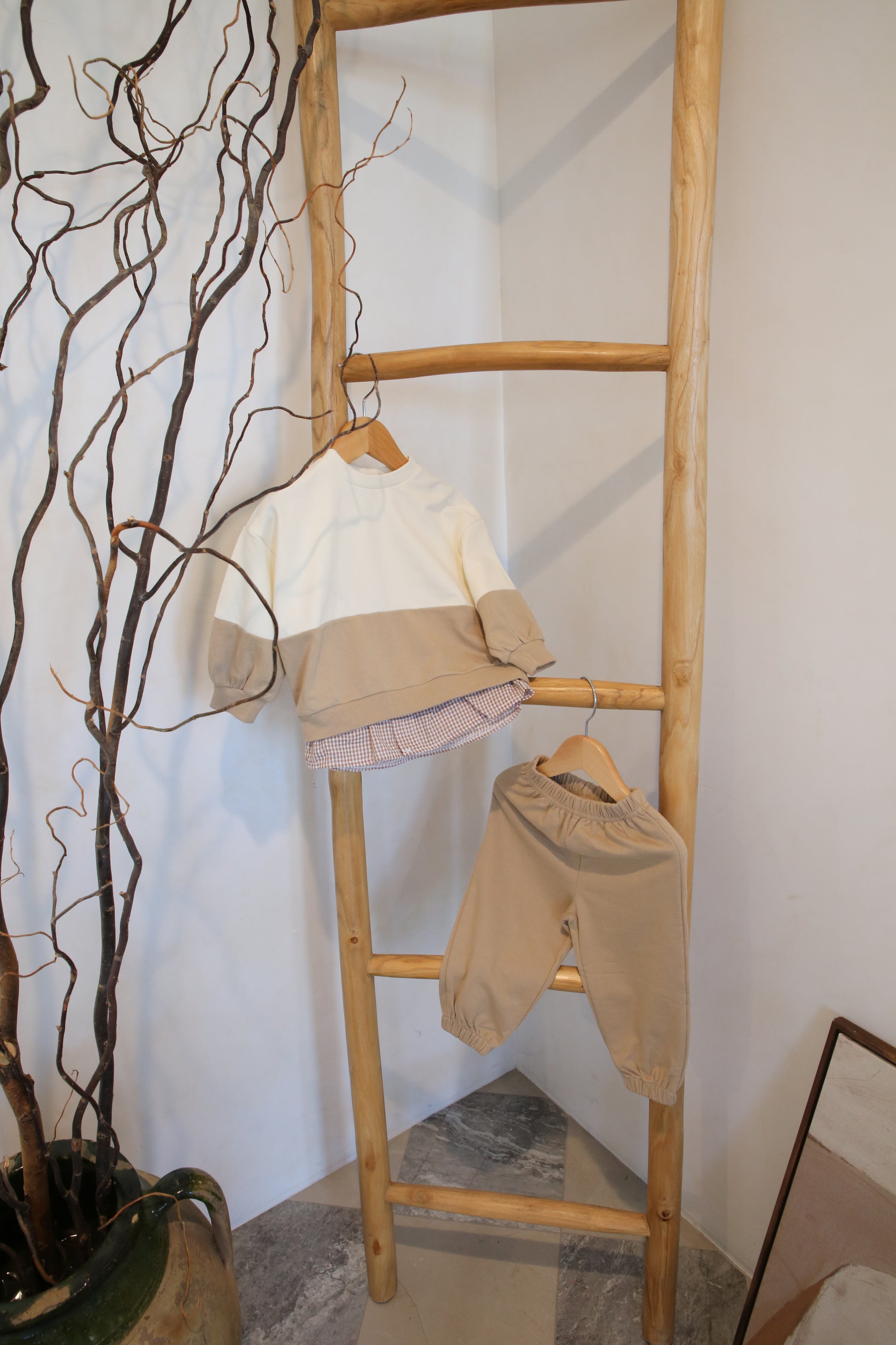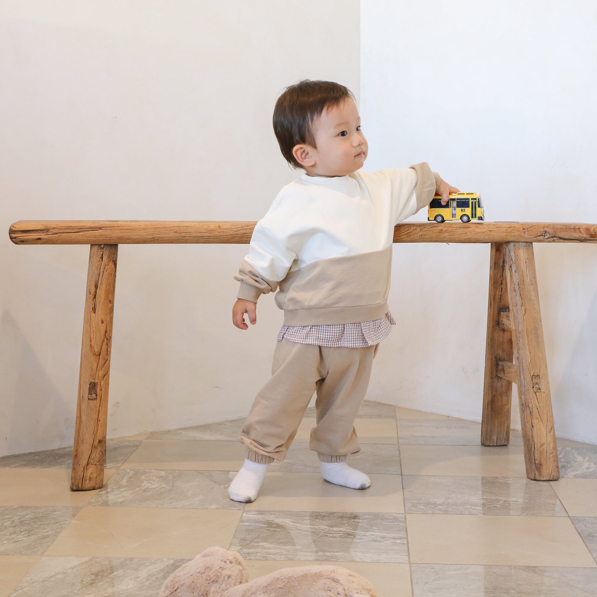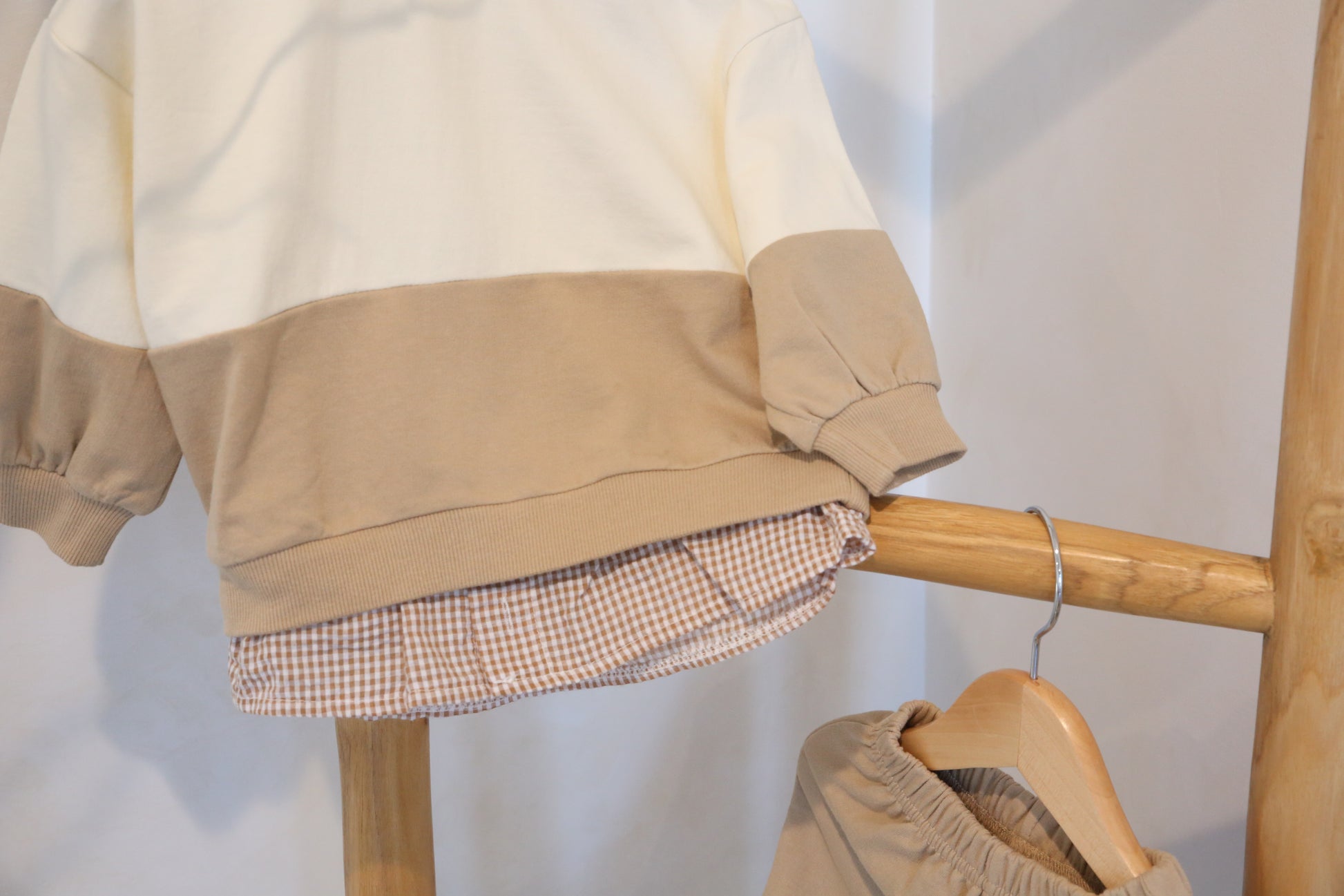 this two-tone top and bottom set features a classic checkered shirt peeking out from underneath—giving your little one a stylish look without the fuss of extra layers